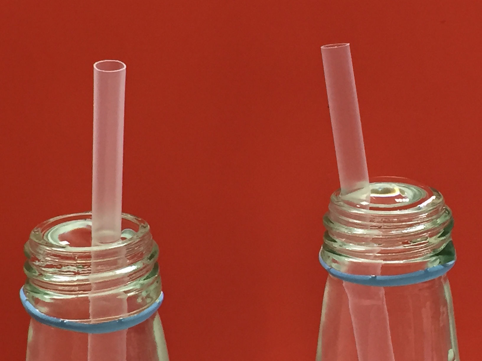 真正的低氘飽和氫水>右邊是低氘飽和氫水,左邊是一般飲水機的飲用水。低氘飽和氫水因為將水中的氘拿走了一些,水的密度較高,若緩緩將水倒在杯中時,可觀察到,水體看起來較亮也較稠。因為低氘飽和氫水的密度較高,水的表面張力也較大。若開瓶後在水中插一支吸管。另外一個空瓶裝上一般的自來水或飲用水,也插上一支吸管。就可以觀察到兩者有明顯的差異。