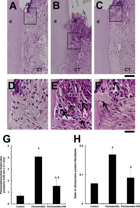 In the periodontitis group, lipid deposition in the descending aorta was observed. The periodontitis group also showed significant higher serum levels for ROS and oxidised low-density lipoprotein-cholesterol (ox-LDL) (1.7 and 1.4 times, respectively), and higher aortic expression levels of nitrotyrosine and hexanoyl-lysine (HEL) (7.9 and 16.0 times, respectively), as compared to the control group (p < 0.05). In the periodontitis + HW group, lipid deposition was lower. Lower serum levels of ROS and ox-LDL (0.46 and 0.82 times, respectively) and lower aortic levels of nitrotyrosine and HEL (0.27 and 0.19 times, respectively) were observed in the periodontitis + HW group than in the periodontitis group (p < 0.05).